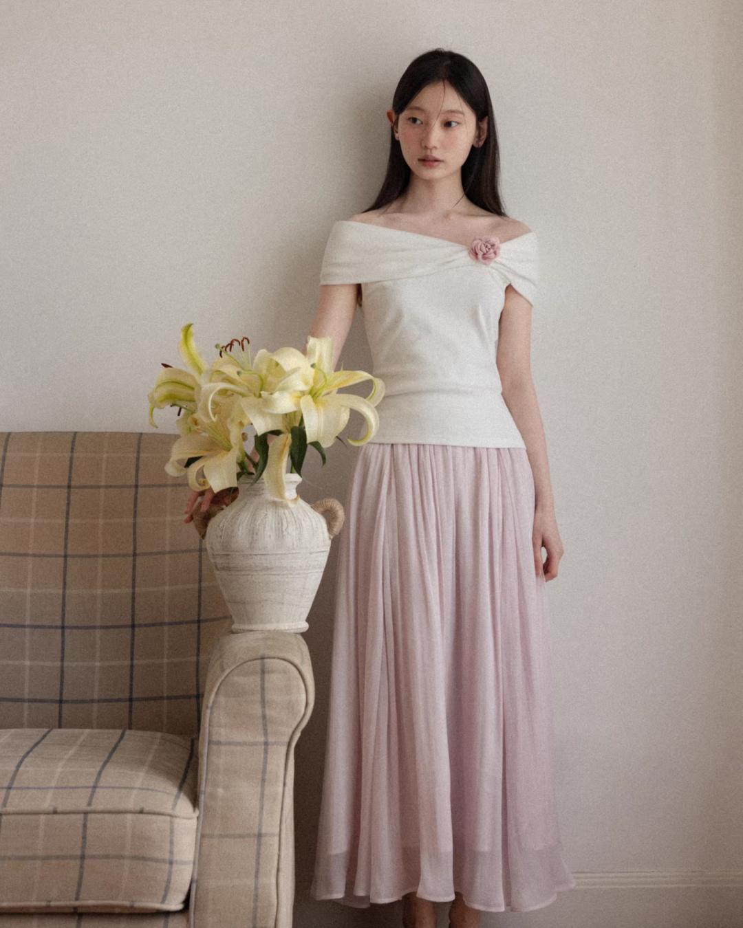 Off-shoulder Ribbon Design Cloth & Pink Long Skirt CA0023