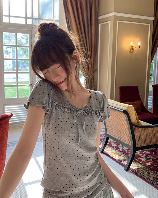 Polka Dots Gray Ribbon T-shirt & Short Pants BU0178