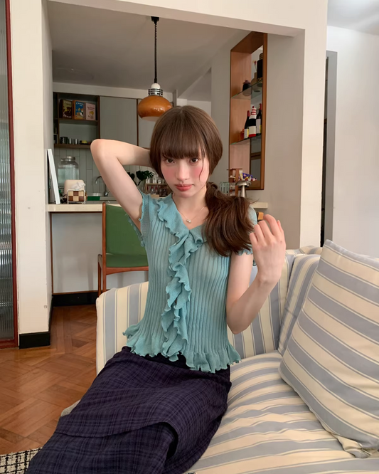 Frill V-neck Short Sleeve Knit BU0179